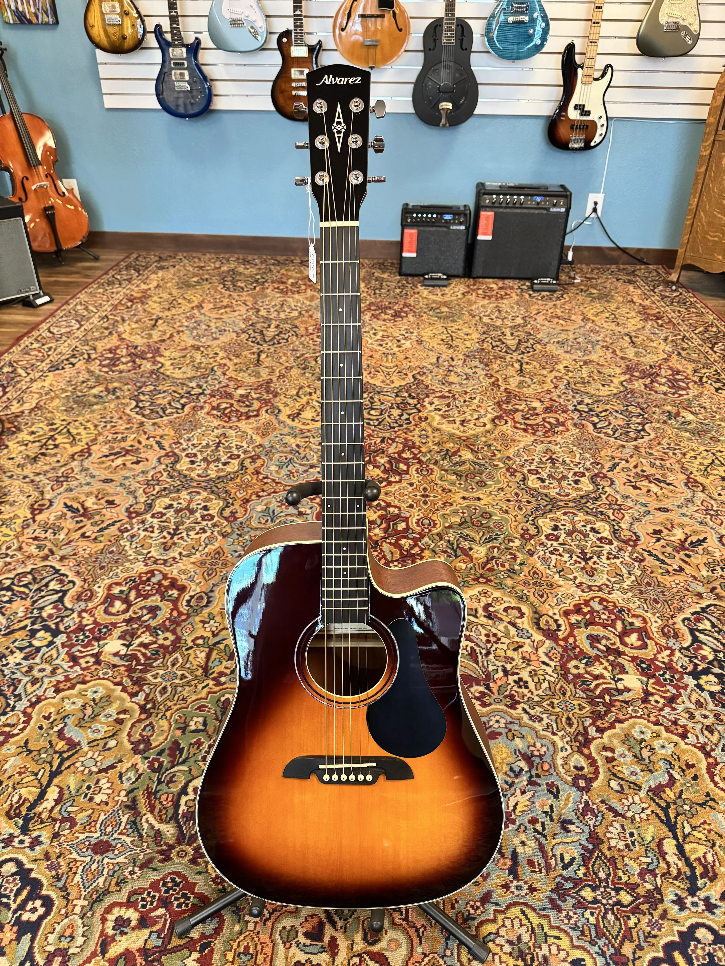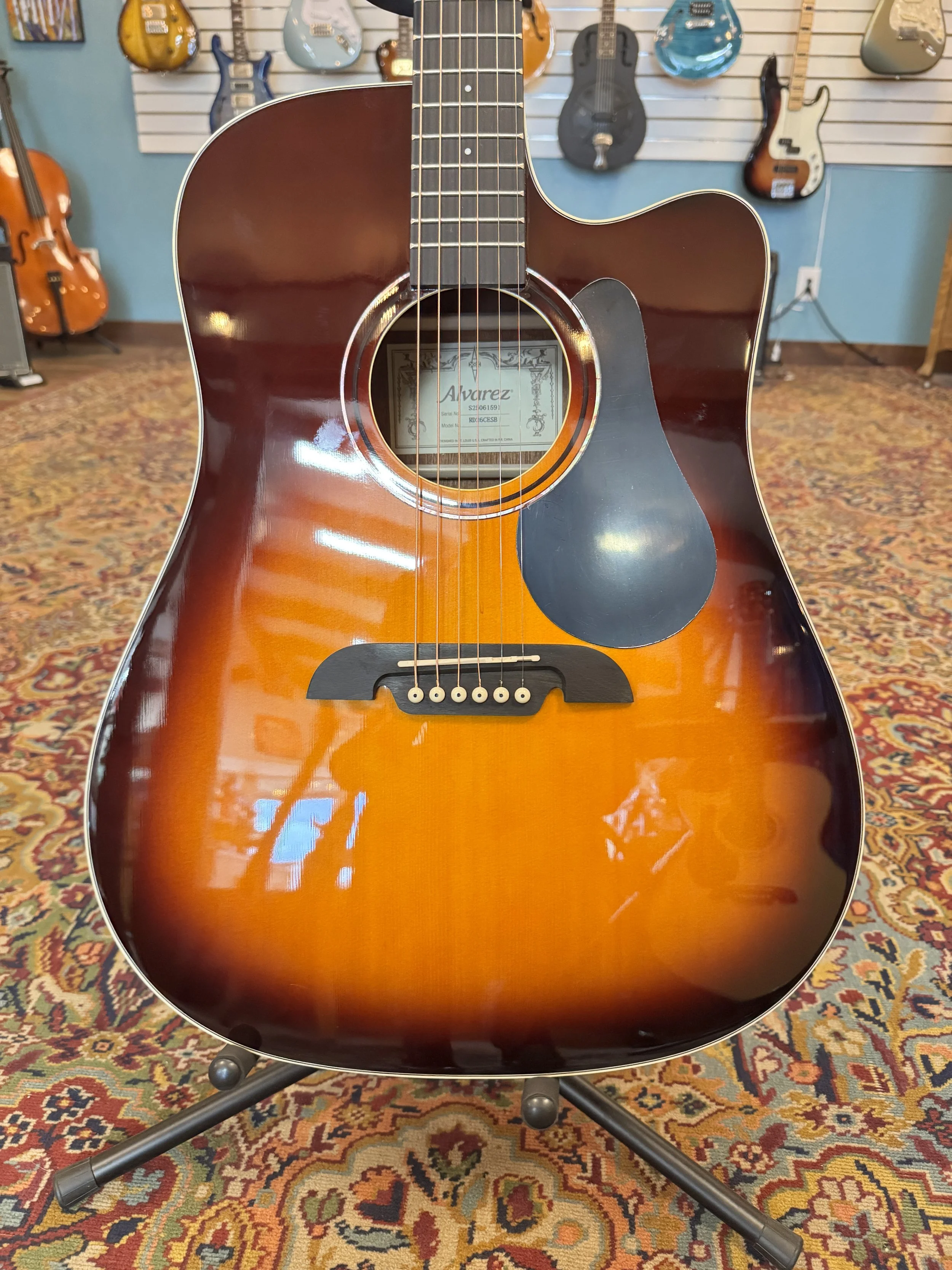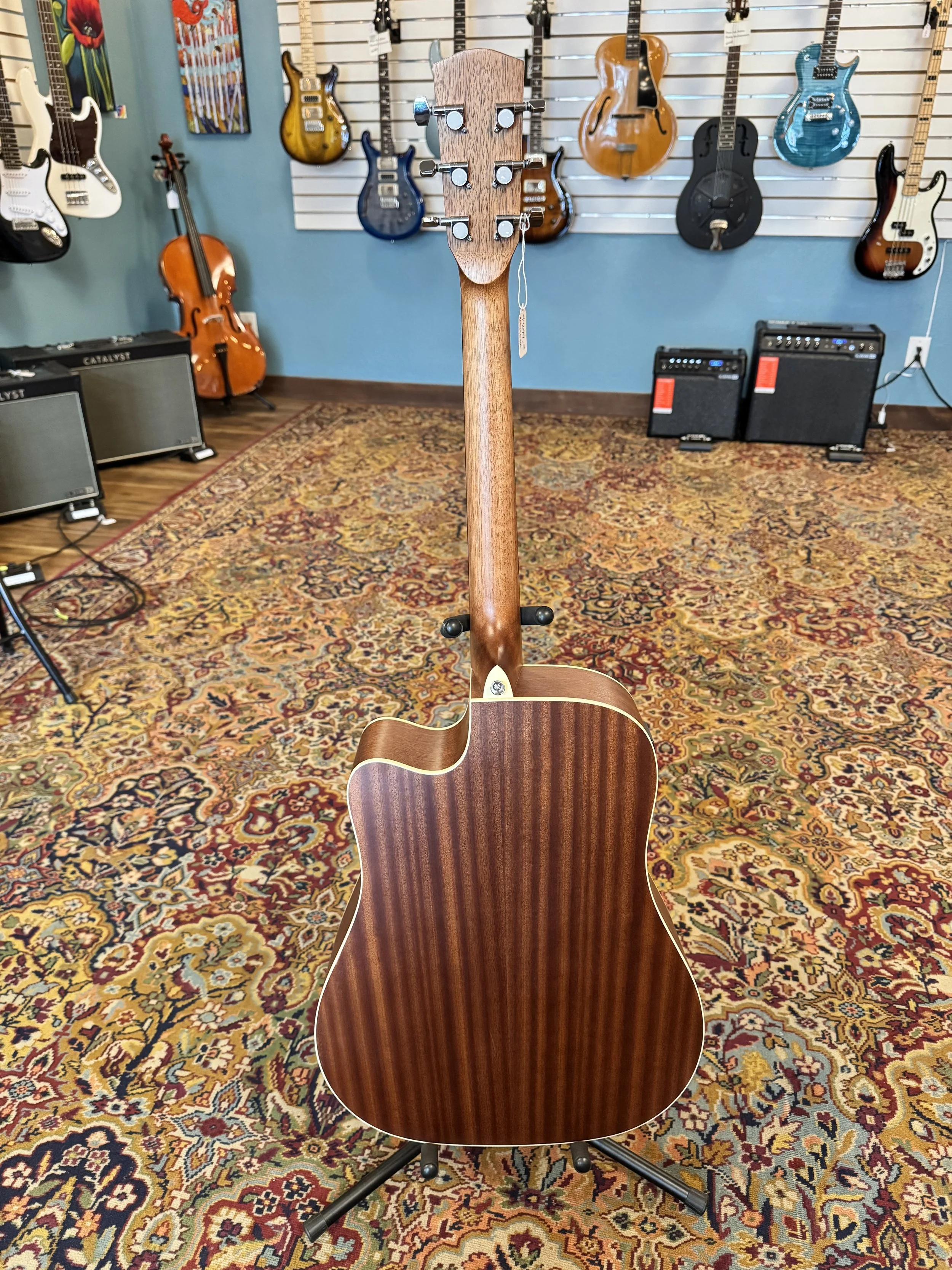 The Guild D-150CE is a full-bodied dreadnought. This is a used guitar, in like new condition with a solid Sitka spruce top and solid rosewood back and sides for a rich, balanced tone. It features a cutaway for upper fret access and built-in Fishman electronics for great amplified sound, making it perfect for both stage and studio.