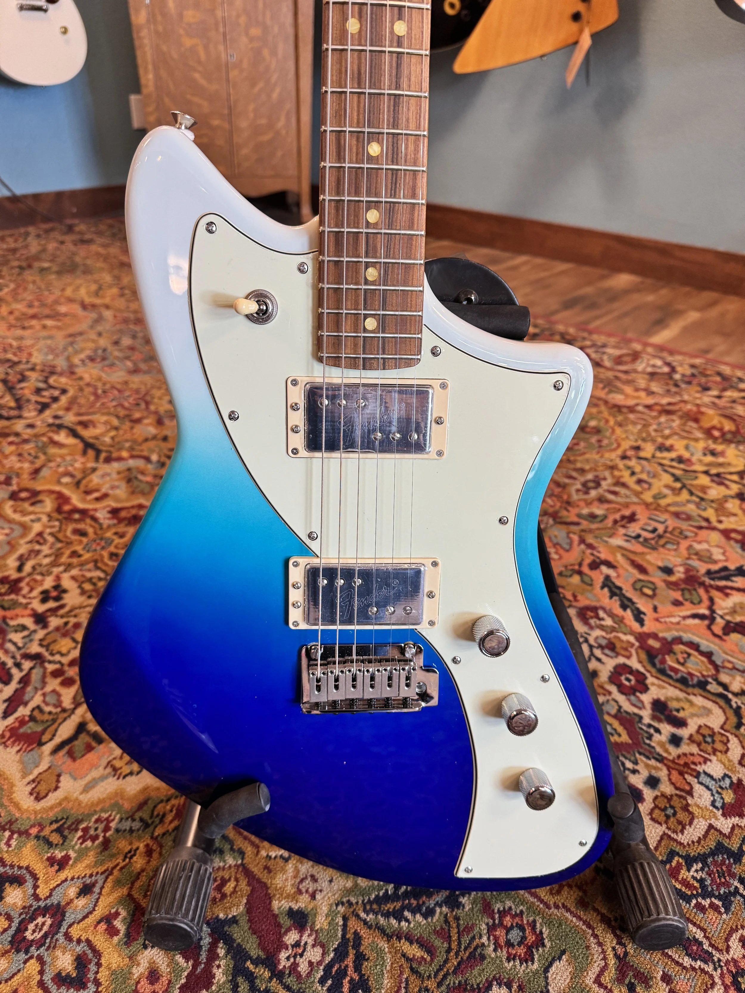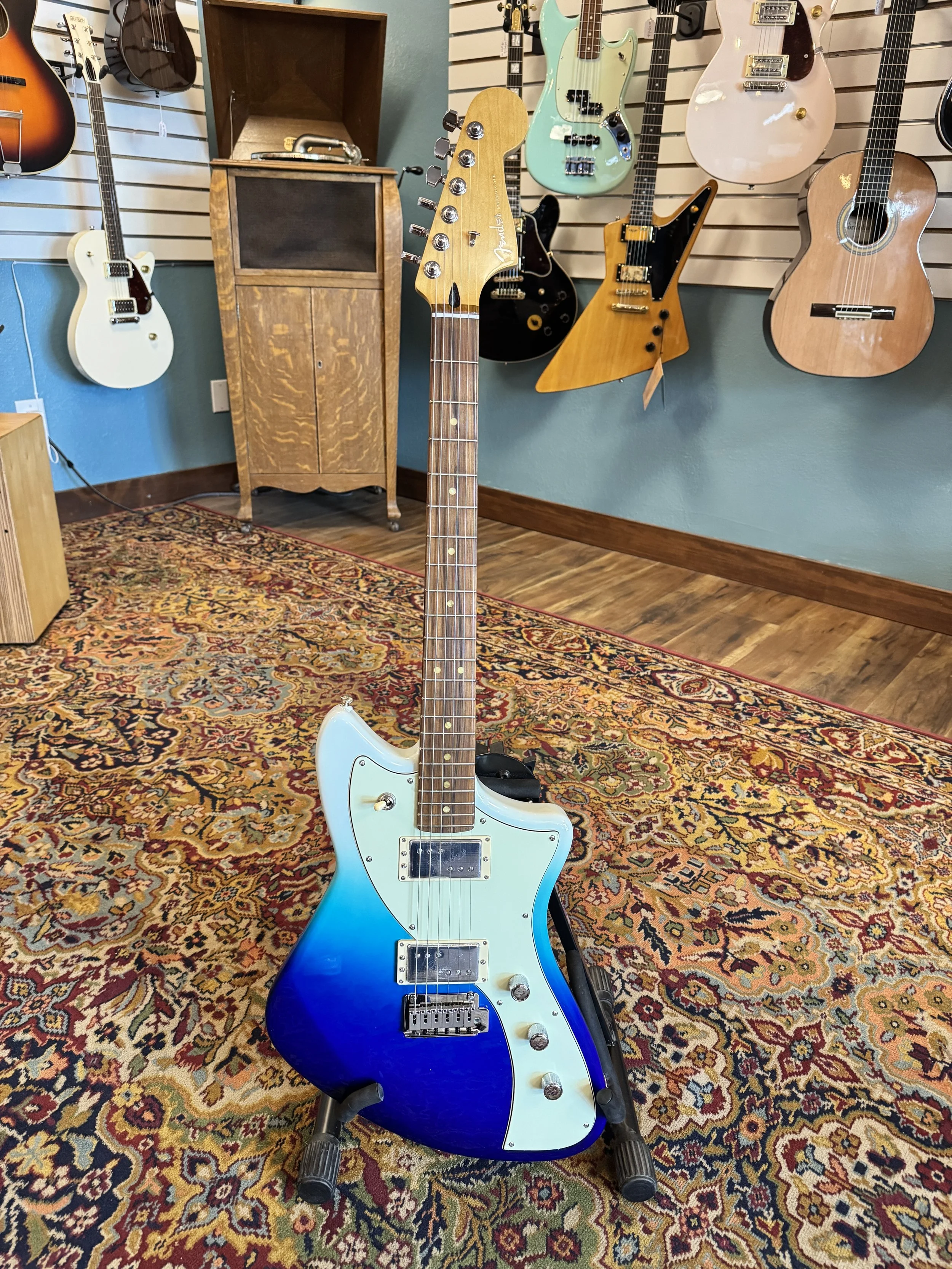 The Squier Classic Vibe '70s Jaguar in Surf Green. This is a used guitar, in like new condition and features a poplar body, maple neck, and Fender-designed single-coil pickups. It offers vintage style with classic Jaguar switching and a floating tremolo for versatile tones.